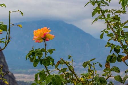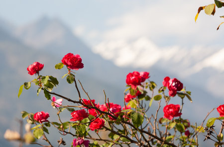 Red roses on a mountain backdrop.Himalayan mountains. Manali, Himachal Pradesh India.