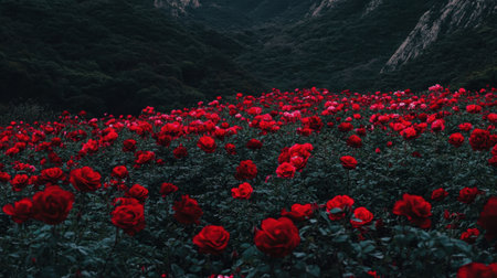 A breathtaking view of a field filled with vibrant red roses, set against stunning mountains under a clear sky, capturing the essence of nature's beauty.