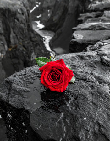 A single, vibrant red rose rests on a dark, wet stone, its brilliant color a stark contrast to the monochrome rocky landscape behind it. This powerful image evokes feelings of love, loss, and hope, symbolizing beauty and resilience in a harsh or desolate world. A perfect visual for concepts of remembrance, passion, or standing out.
