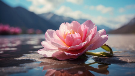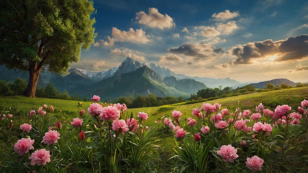 pink blooms grace the majestic mountain, surrounded by a serene sky and lush green trees. this hazy romanticism-inspired scene showcases light-filled landscapes in the gongbi style, creating contrast-focused photos reminiscent of monochromatic masterpieces. adonna khare's influence is evident, incorporating traditional japanese artistic techniques for a captivating composition. ai generated