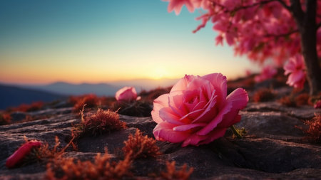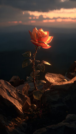 A solitary rose blooms, bathed in warm, golden light. Its delicate petals are highlighted against a backdrop of dark rocks and a moody, colorful sky. The composition emphasizes the contrast between the flower's vibrancy and the rugged environment, suitable for various editorial and commercial projects.