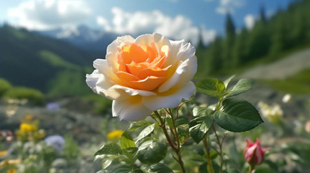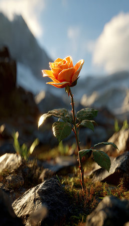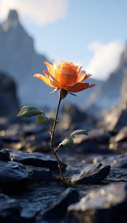 An orange rose, illuminated by sunlight, stands tall within a rugged landscape. The image showcases a single flower's delicate petals, contrasted by the rough texture of rocks. The composition includes a mountain backdrop, suggesting an outdoor environment suitable for editorial or commercial purposes.
