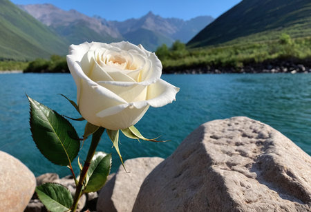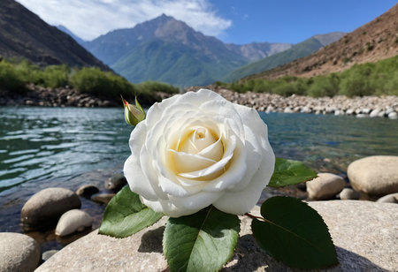 White rose on the bank of a mountain river with mountains in the background
