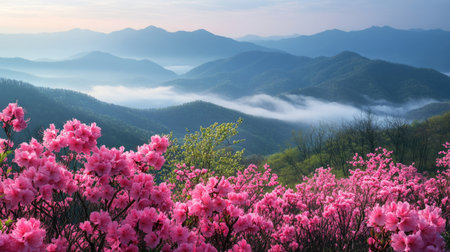 Pink azalea blossoms glowing in the early morning light, with mist-covered mountains creating a dreamy backdrop at Hwangmaesan Mountain, near Hapcheon-gun, South Korea.