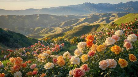 A majestic view of multicolored roses blooming on a hillside, with breathtaking mountains in the background, capturing nature beauty.