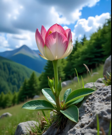 Beautiful pink flower on the background of the mountains and blue sky