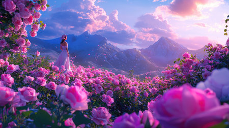 A captivating scene featuring a woman in a flowing dress standing among vibrant pink roses. The majestic mountains and colorful clouds create a serene and enchanting atmosphere at dusk.