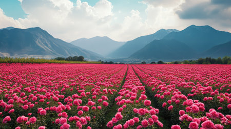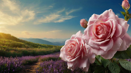 Scenic European rose fields, vivid blooms surrounded by mountains, leaving space for text or branding
