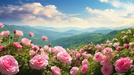 Panoramic view of the mountain range in the summer. Beautiful landscape with red roses.
