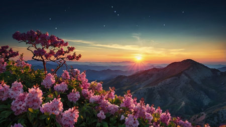 Rhododendron flowers in the mountains at sunset with stars
