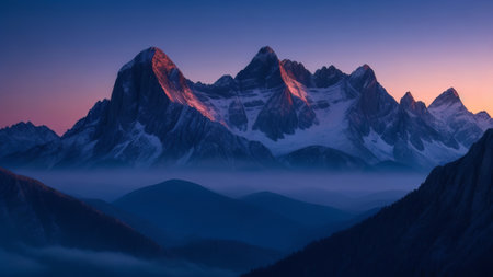 Majestic mountain peak rises high above tranquil meadow in winter generated by artificial intelligence