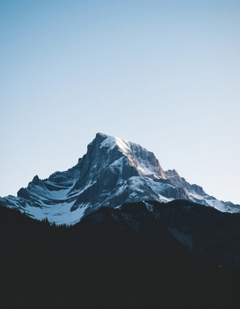 Minimal mountain landscape with black peaked top with white snow under blue sky. Snow-covered pointy peak in sunlight. Atmospheric mountain scenery with peaked top in sunshine. Awesome mountain top.