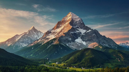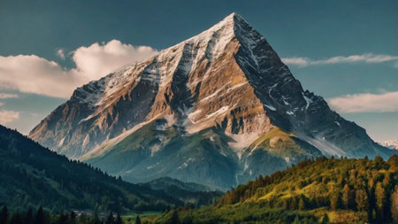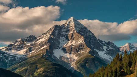 mountain landscape with snow covered peaks and coniferous forest in the foreground