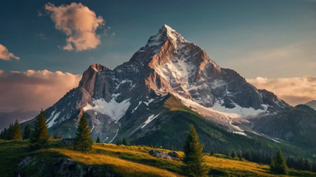 Beautiful alpine mountain landscape with snow covered peaks in the clouds
