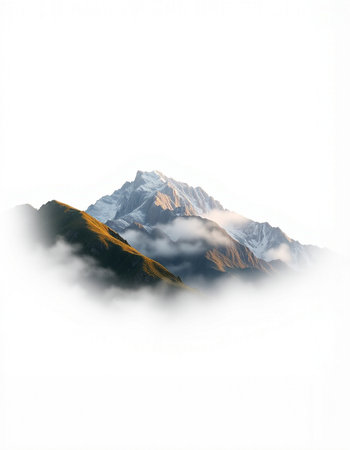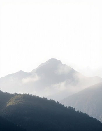 A stunning view of a solitary mountain peak enveloped in mist and fog. The serene landscape embodies tranquility, making it perfect for nature enthusiasts and wanderers.