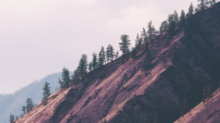 Experience the calm allure of a mountain slope adorned with evergreen trees under a soft cloudy sky, showcasing the tranquil beauty of untouched nature.