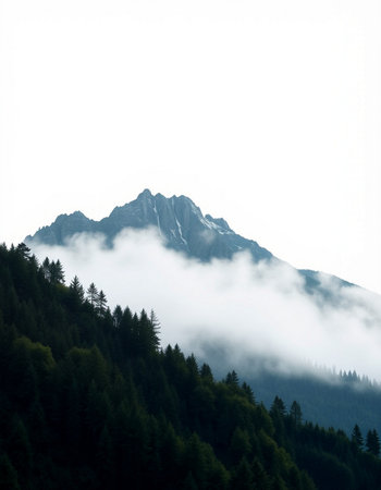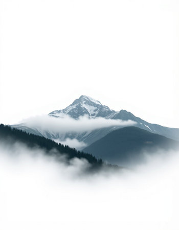A stunning view of a solitary mountain peak enveloped in mist and fog. The serene landscape embodies tranquility, making it perfect for nature enthusiasts and wanderers.