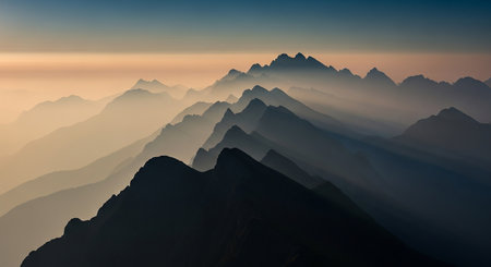 Experience the serene beauty of majestic mountain ranges at dawn, enveloped in mist, showcasing a breathtaking landscape with layered peaks and soft glow.