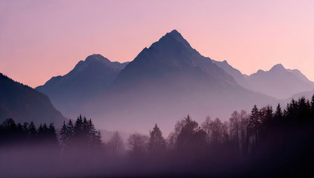Mountain Range at Dawn A majestic mountain range is silhouetted against a soft, pastel-colored dawn sky, with mist filling