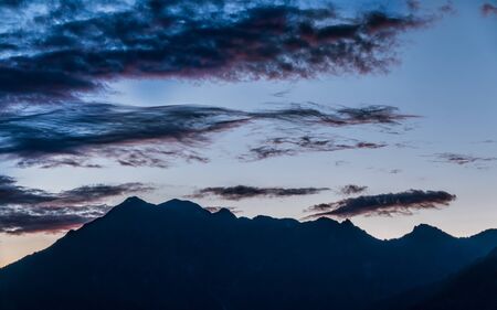 Silhouette of mountain range at sunset. Beautiful cloudy sunset in mountains