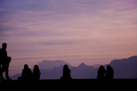 Silhouttes of people enjoying sunset, moutains background in Antalya, Turkey