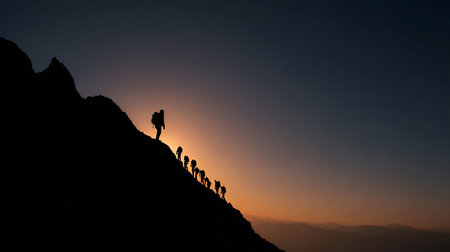 A group of hikers silhouettes against a breathtaking sunset, creating a dramatic scene that captures the essence of adventure and exploration.