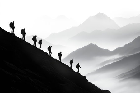 A captivating scene showcasing a group of hikers in misty mountains. The stunning landscape combines adventure and nature, presenting a moment of exploration and connection with the wilderness.