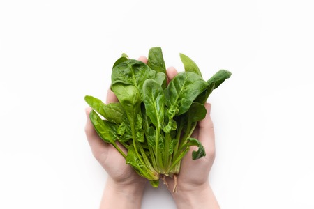 Woman hands holding spinach at white background, top view. Healthy eating concept