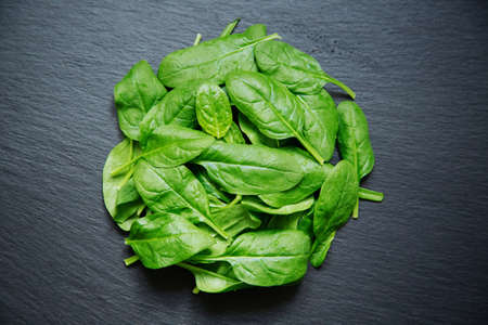 Clean food concept. Bunch of leaves of fresh organic spinach greens on a black background. Healthy detox spring-summer diet. Vegan Raw Food.