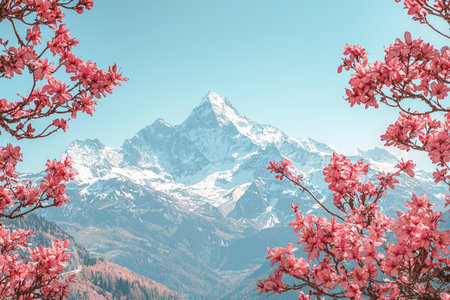 A breathtaking mountain range with snow-capped peaks under the clear blue sky, surrounded by lush greenery and wildflowers in full bloom. Focused on the face, with perfect lines, in the style of anime, in high resolution, with a pink color scheme, natural lighting, a tranquil scene, and a peaceful mood, inspired by Ghibli art. --chaos 30 --ar 3:2 --quality 2 --stylize 250 --v 6.1 Job ID: f8741345-1469-477a-a2e5-df4c93987eea