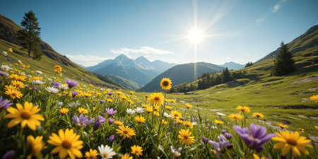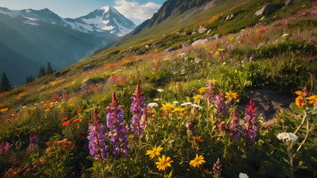 Wildflowers Meadow Mountains Colorful wildflowers blooming in a sunny mountain meadow with green grass and distant mountain peaks under bright sunshine