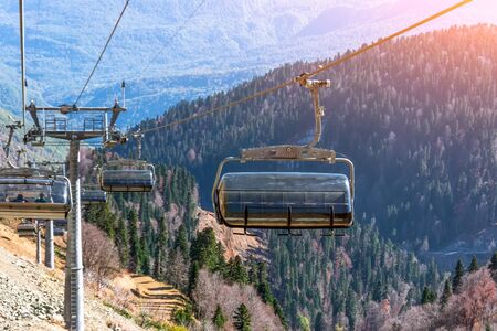 cable car road with grey cabines at mountain landscape. Autumn. Soshi, Rosa Khutor