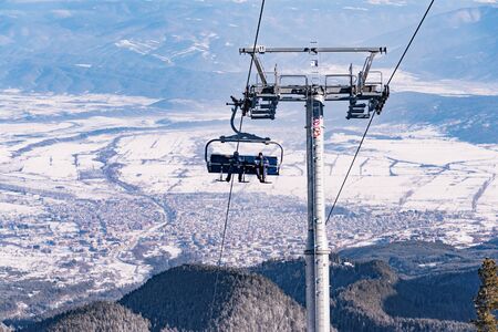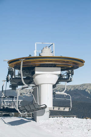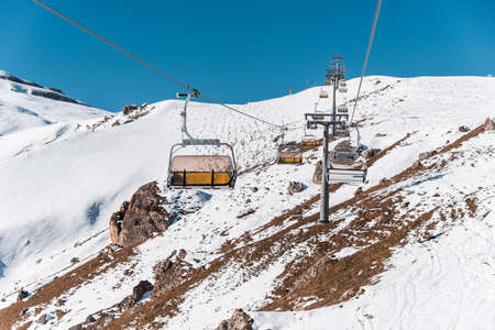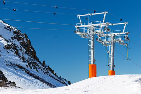 Chairlift or elevated passenger ropeway at ski area. Winter ski resort.