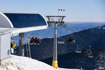 Bulgaria. Bansko. 08 February 2020.Ski resort in Bansko. Snowy ski slopes and chair ski lifts station in winter mountain ski resort. Under blue sky on sunny day