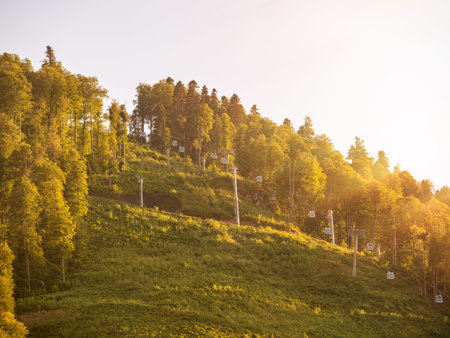 The cable car in the summer on a green slope, illuminated by the sun at sunset. Krasnaya Polyana, Sochi, Russia