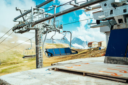 Open cable car, chairlift with empty seats on the background of a blue sky with clouds, a view from below of the ascent. The concept of a dangerous, risky lift.