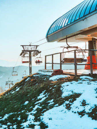 Chair lift going down against the backdrop of snow capped mountains in yellow tone Alpine skiing and snowboarding winter sport
