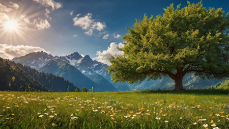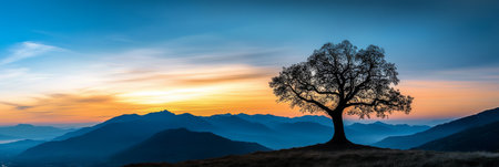 A serene landscape features a tree silhouette against a stunning sunset, framed by majestic mountains and lush fields, embodying natural beauty and offering peace to all who see it