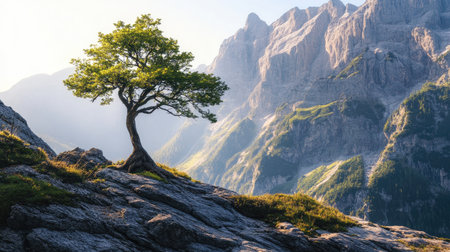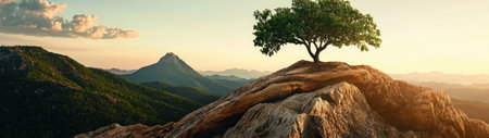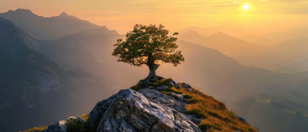 A single tree stands prominently on a mountain summit, silhouetted against a cloudy sky. The landscape showcases rugged peaks, illuminated by golden sunlight. The image exhibits a natural style with a focus on color and texture, suitable for various editorial and commercial applications.