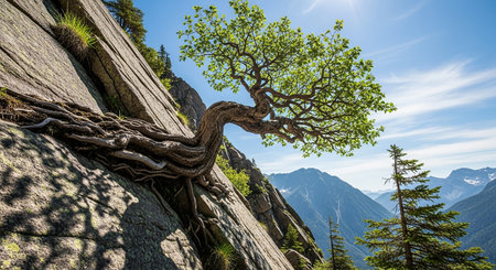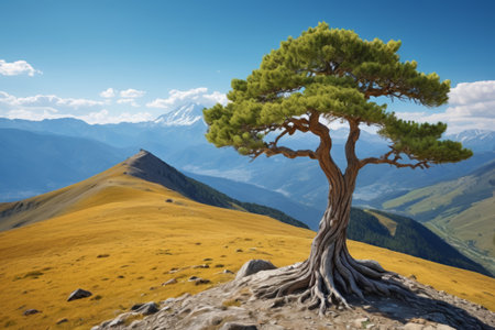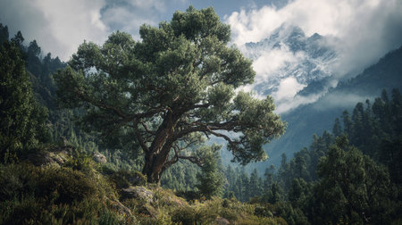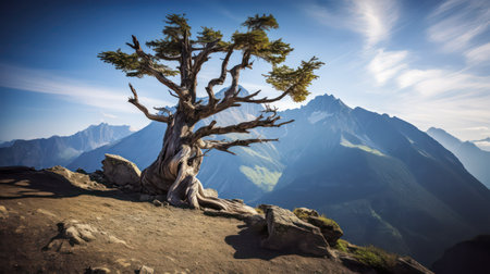 a majestic tree stands on a mountainside, with towering mountains as its backdrop. this breathtaking photograph captures the beauty of nature in the style of unreal engine 5, showcasing photographically detailed portraitures. the uhd image showcases the intricate details of the tree's bentwood, while evoking a sense of wonder with its high detailed hunting scenes. this national geographic photo is a stunning portrayal of the