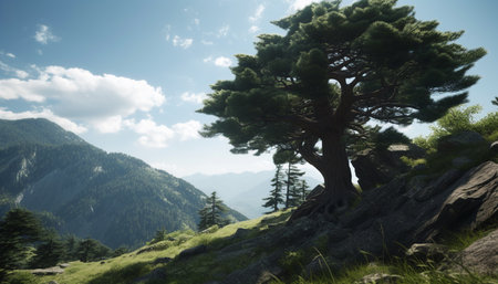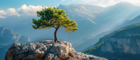 Mountain landscape with tree in summer, scenic lonely pine on cliff top, panoramic stunning view. Concept of nature, sky, sunlight, travel, background. Generative AI