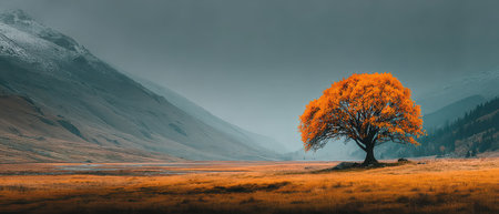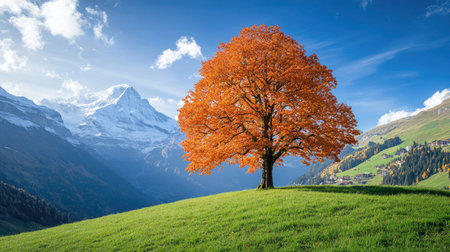 A striking orange leaf tree stands proudly on a green meadow, framed by majestic mountains. The clear blue sky and soft clouds create a serene autumn landscape, inviting tranquility and wonder.