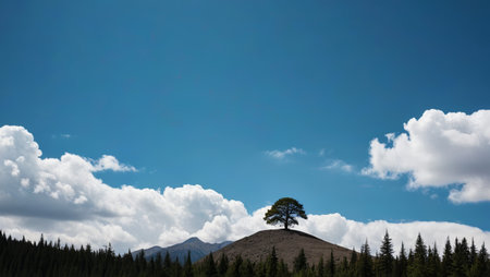 The natural landscape of isolated trees on the top of the mountain and blue sky and white clouds
