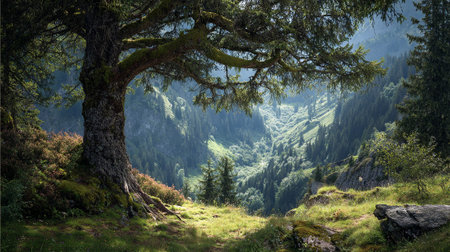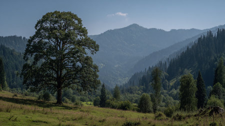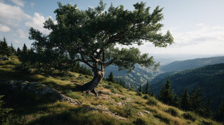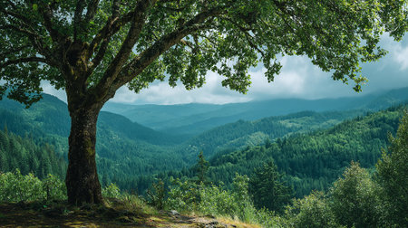 Majestic Tree Stands Guard Over Rolling Hills and Verdant Forest Slopes