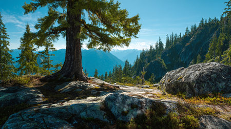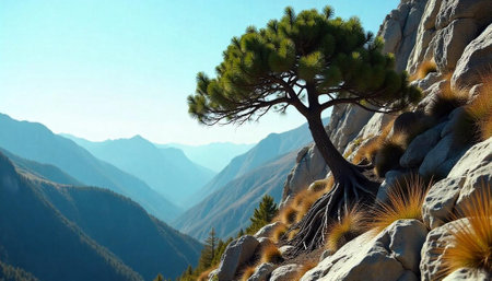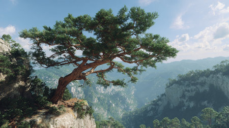 Old Pine Tree on Rocky Cliff Overlooking Mountainous Landscape under a Sunny Sky