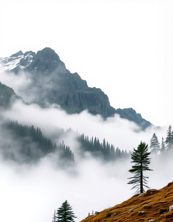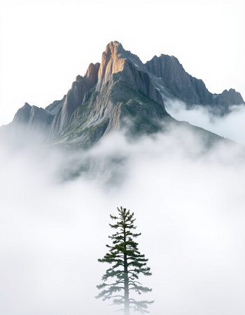 A single tree stands prominently atop a hill, its silhouette stark against a backdrop of distant mountains. The scene is enveloped in a soft mist, creating a serene and atmospheric landscape. The composition utilizes a muted color palette, offering potential use in various design projects and editorial contexts.