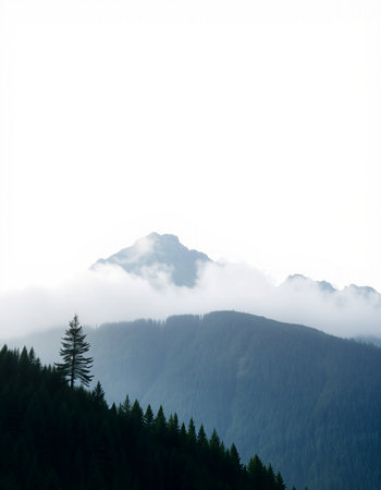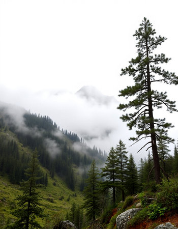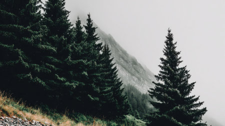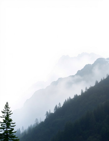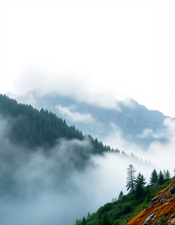 Explore a breathtaking forest landscape where majestic mountains meet lush evergreen trees, shrouded in mist, creating an atmosphere of serene tranquility.
