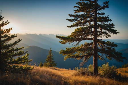 Pine tree in the mountains at sunset. Beautiful nature background.