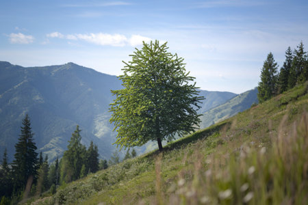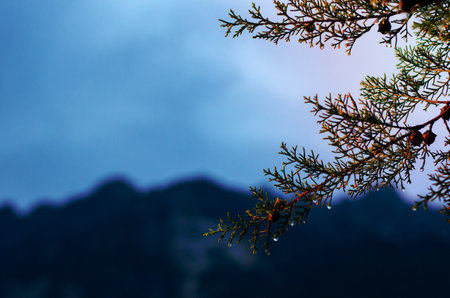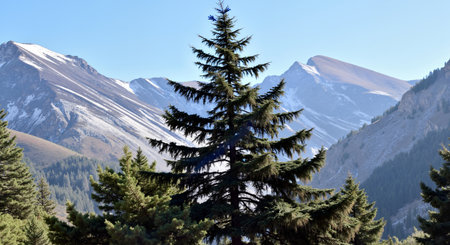 Beautiful mountain landscape with coniferous tree in the foreground.