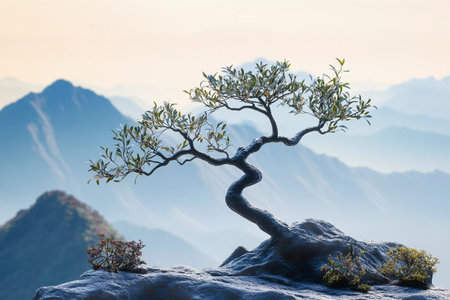 A scenic view of a tree perched atop a rocky mountain peak is featured, bathed in the soft glow of either sunrise or sunset. The composition highlights the textured ruggedness of the rocks and the layered effect of the mountain range in the background. It may be suitable for travel, environmental, or scenic-related projects.